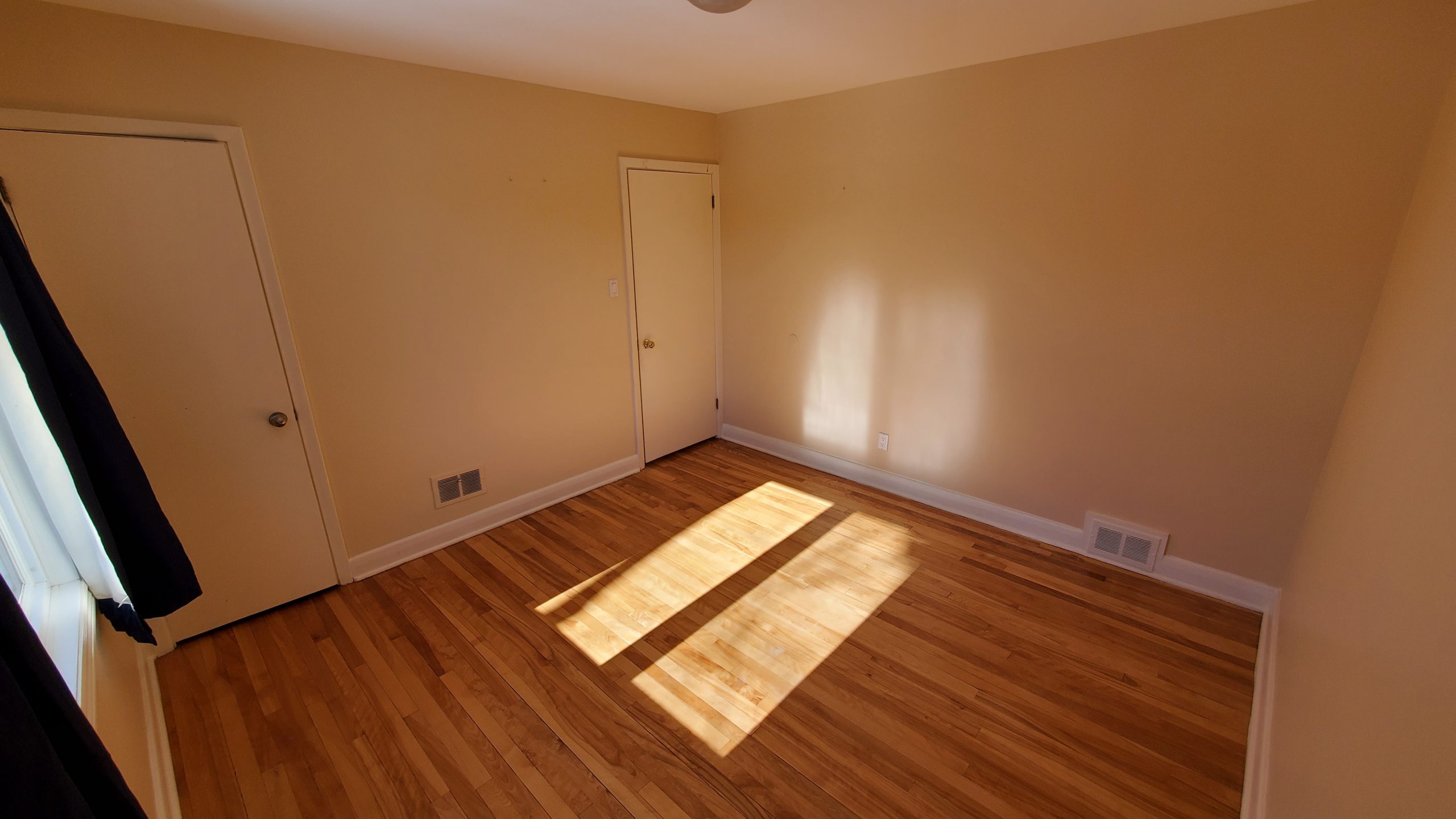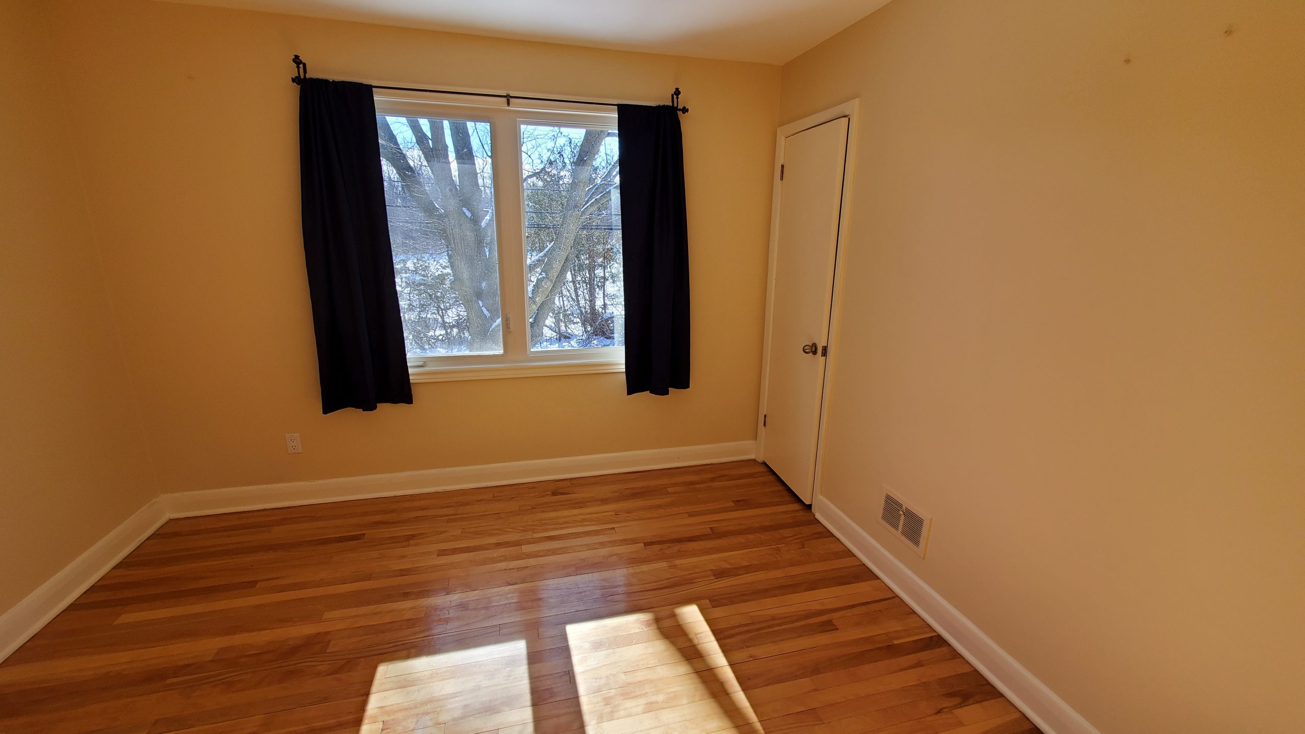 It has large windows and hardwood flooring throughout, making it bright and cozy.